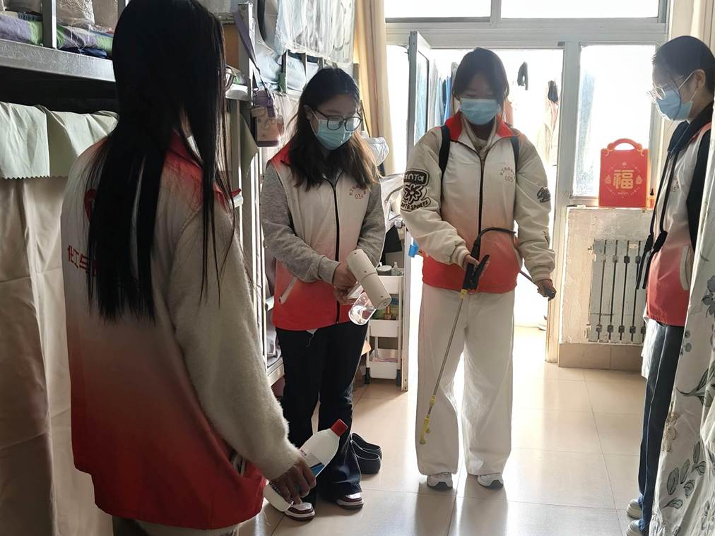 志愿者携带蓝光喷雾消毒枪、背负式喷雾器等专业消杀设备,严格按照消毒操作规范,对宿舍公共区域展开全方位、无死角消杀工作。针对高频接触点位,消毒枪有效阻断病菌传播路径;针对宿舍楼人员密集流动区域,志愿者们使用背负式喷雾器进行全面喷洒,不放过任何卫生死角;在宿舍里志愿者引导大家重视日常消杀与防护工作。